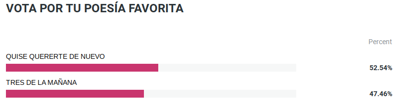 La poesía Tres de la mañana consiguió el 47% de los votos y la poesía Quise quererte de nuevo obtuvo el 53% de los votos.