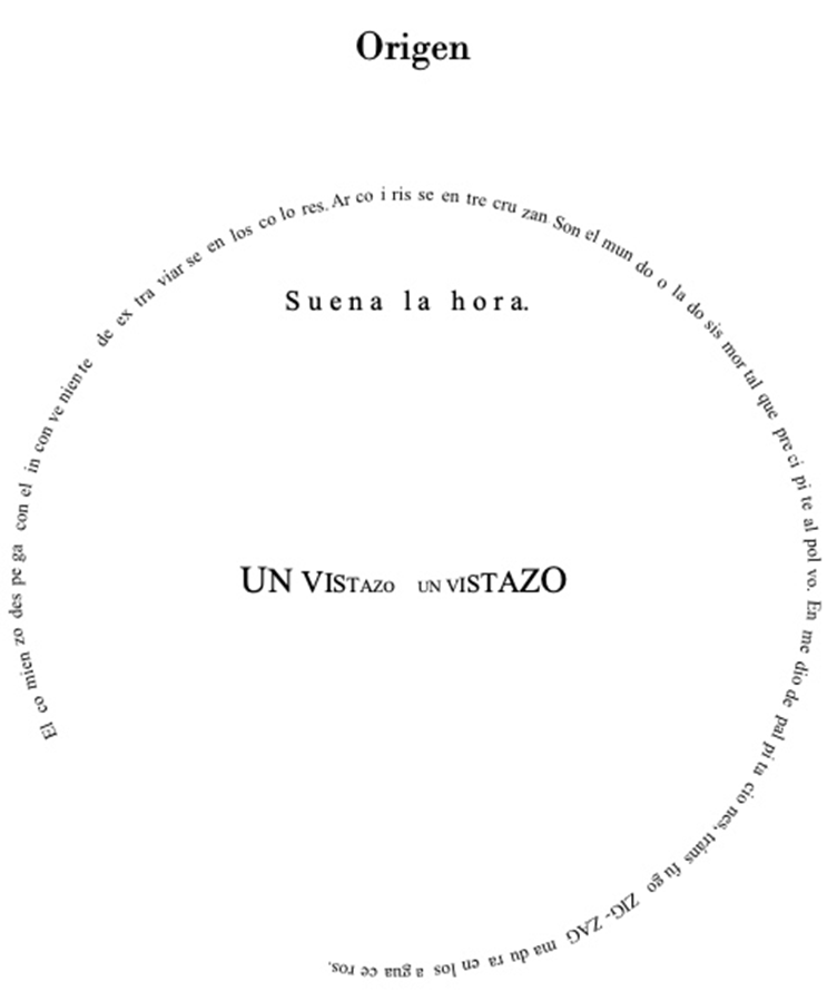 Origen: Suena la hora. Un vistazo / un vistazO. El comienzo despega con el inconveniente de extraviarse en los colores. Arcoíris se entrecruzan. Son el mundo o la dosis mortal que precipita al polvo. En medio de palpitaciones Tránsfugo ZIGZAG Madura en los aguaceros.